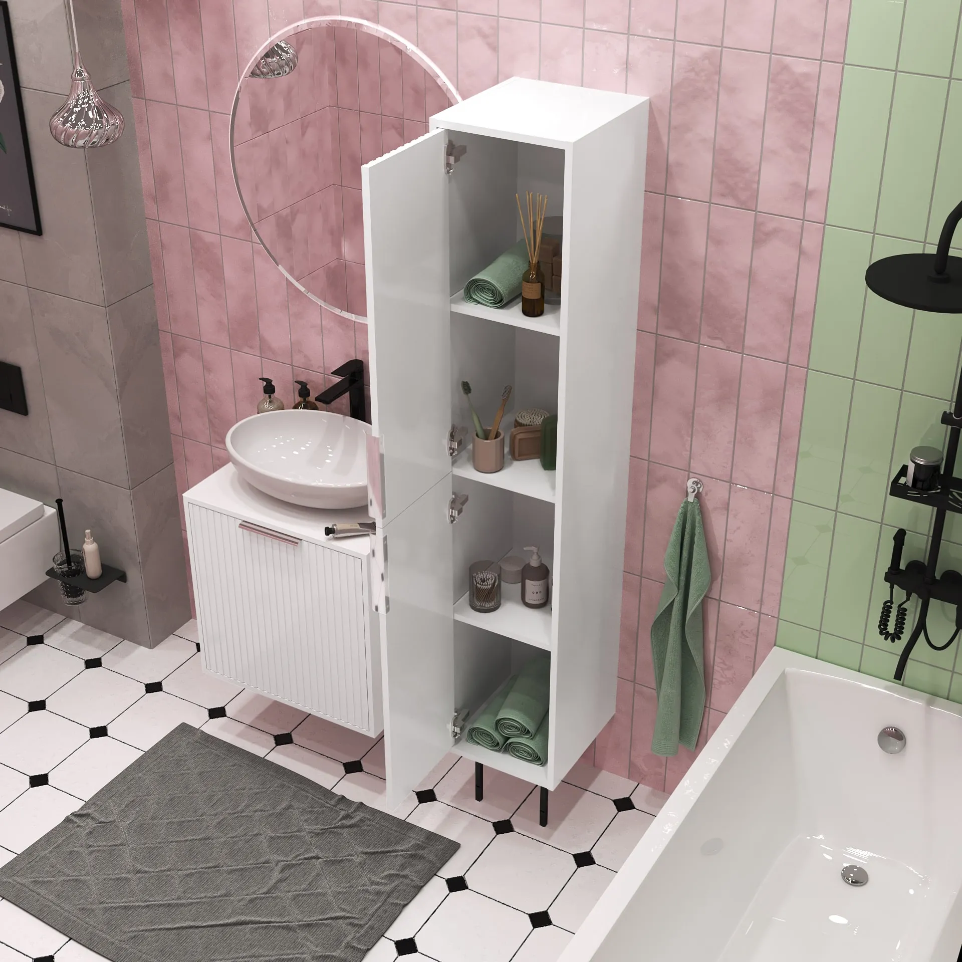 •    Модель позволяет организовать грамотное хранение косметики, предметов ежедневного пользования, средств личной гигиены и бытовой химии. Благодаря полкам у каждого предмета будет свое определенное место. Это позволит сохранить порядок в комнате и скрыть визуальный шум.