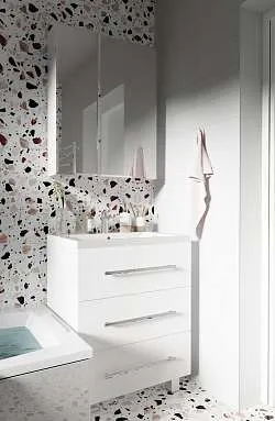 Стильная и лаконичная тумба для ванной комнаты, в дизайне которой нет ничего лишнего - только минимализм и акцент на безоговорочную функциональность. Отсутствие ручек и строгие геометрические формы делают ее актуальной для интерьеров в абсолютно любой современной или эклектичной стилистике. Благодаря качественной фурнитуре ежедневное использование тумбы отличается максимальным удобством. Практичное разделение ящиков на небольшие отсеки позволяет с комфортом организовать хранение косметики и других вещей. Глянцевая белая поверхность гармонично дополнит пространства в любой цветовой гамме.