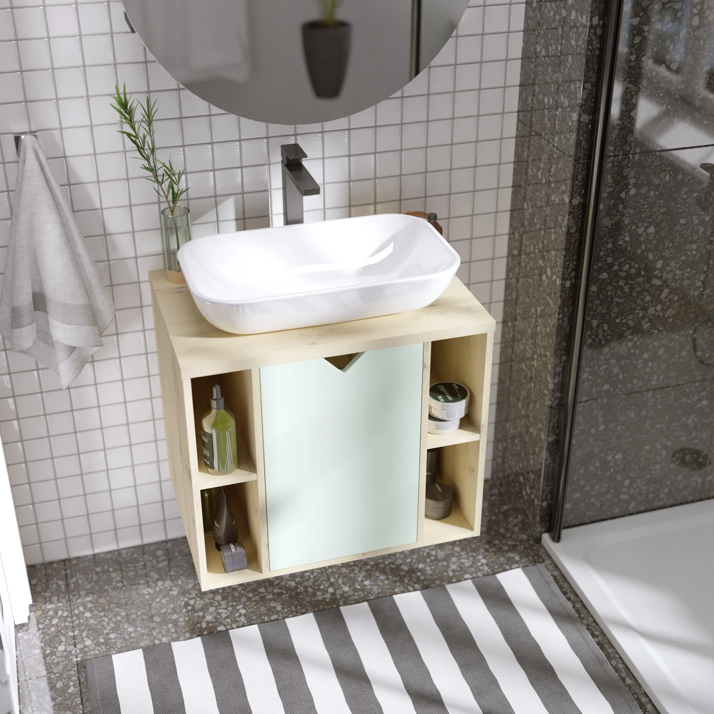 • В тумбе удобно организовать хранение. В открытых полках можно разместить органайзеры, предметы ежедневного пользования и декоративные элементы. А в закрытой – бытовую химию или средства личной гигиены.