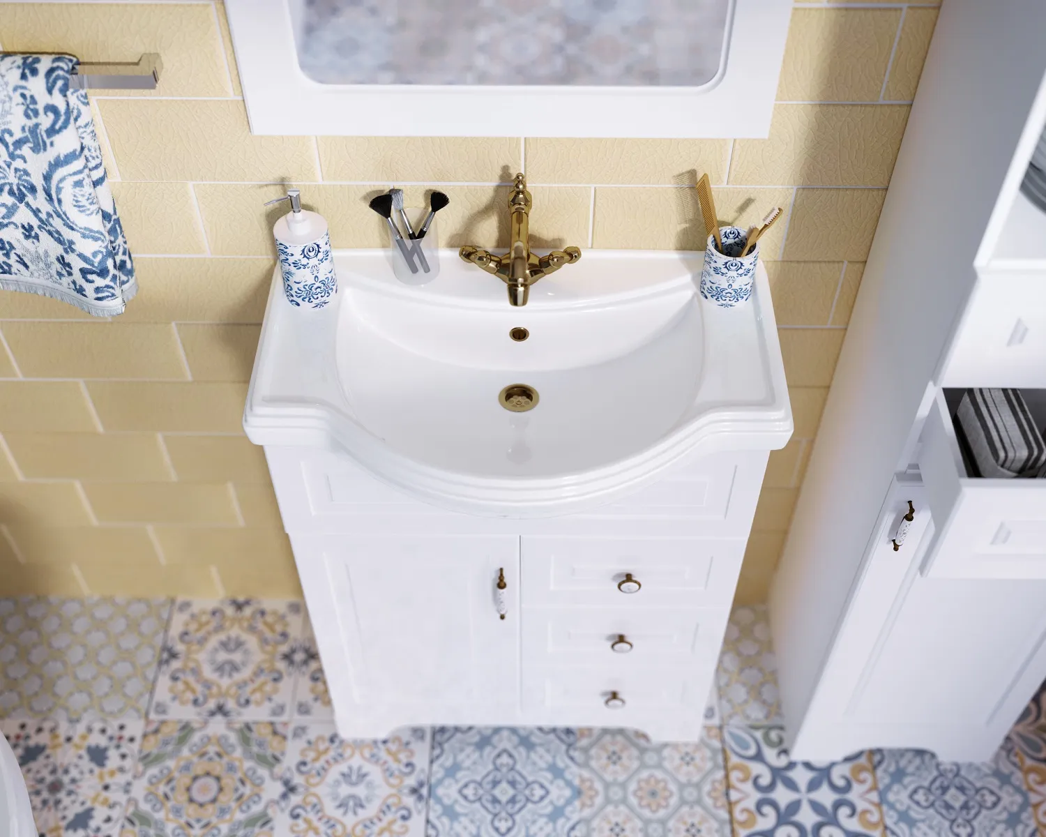Тумба в классической благородной стилистике, которая разделена на несколько функциональных отсеков разного размера, благодаря чему превосходно подходит для хранения самых разнообразных предметов и личных вещей. Она станет прекрасным выбором для тех, кто ищет безупречное сочетание эстетики и функциональности в мебели для ванной комнаты. Изящная и элегантная, эта тумба отражает дух прованса и станет актуальным и уместным дополнением самых взыскательных традиционных интерьеров. Комфорт и удобство ее использования обеспечиваются качественной, проверенной временем немецкой фурнитурой Hettich.